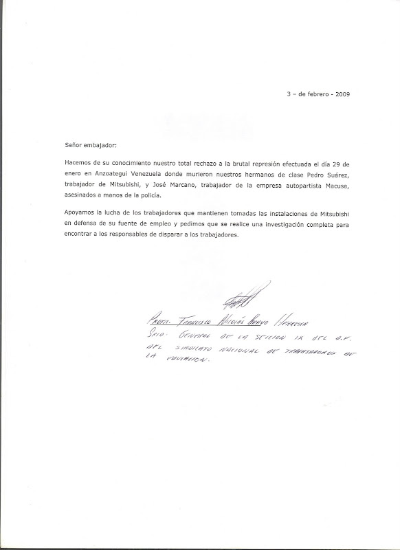 Protest messages against killing of two workers in occupied Mitsubitshi factory in Venezuela Share TweetWe have received more messages of protest against the killing of the two workers in the occupied Mitsubitshi factory in Venezuela from Sweden and Britain. [Go to latest message]French, Belgian and Venezuelan trade union leaders of oil, chemical and mineworkers condemn assassination of trade unionists of MitsubishiDuring a meeting in Brussels today union leaders of the French CGT and CFDT together with the Belgian FGTB leaders and representatives of Venezuelan trade unions firmed a declaration which among other items "condemned the assassination of the trade unionists Pedro Suarez of the Mitsubishi plant and José Marcano of the Macusa factory". They demand that "the government of the state of Anzoategui in Venezuela opens an investigation and condemns those political assassinations"Signed:Bruno Verlaeckt, president of the Algemene Centrale Antwerp (oil and petrochemical workers union active in the biggest petrochemical cluster of Europe).Paul Lootens, Federal secretary AC -ABVV.Petit Jean Michel, general secretary of Fédération Natonale de l'Industrie Chimique de la CGTLevebvre Sylvain, International secretary of Fédération Chimie Energie de la CFDTBernard Rieu, Responsable for Latin America for the Fédération Nationale Mines Energie of the CGTPascal L ambolez, Responsable Pôle Internationale Fédération Nationale Mines Energie of the CGTFidel Hernandez, president of the trade union training school of oil workers of PDVSA, IEETALCTony Leon, general secretary of oil workers union SintramentpetErik Demeester, coordinator Hands Off Venezuela - BelgiumBrussels, 30the of January 2009Hands Off Venezela Britain, National Steering CommitteeDear Ambassador,We would like to express our outrage at the killing of two workers by the Anzoategui Police in Venezuela. The workers were killed during an attempt to evict them from the Mitsubishi Motor Company plant which they had been occupying since January 22.This was a brutal and unjustified killing of unarmed workers who were only trying to defend their jobs and livelihoods and who are part of the Bolivarian revolutionary movement. We demand that:- there should be no more violence against the workers of MMC or any other group of workers in struggle, and that all legal action against them should be suspended. - that there should be a full enquiry to find out who gave the order to fire on unarmed workers and that those responsible be brought to justice.- that the governor of Anzoategui Tarek William Saab and the national government of President Hugo Chávez must make a public statement on this incident.Long live the Bolivarian RevolutionLong live the workers' struggleHands Off Venezuela Britain, National Steering CommitteePartito della Rifondazione ComunistaDipartimento Partito sui luoghi di lavoro Area Radicamento socialeRoma, 30 enero 2009Protestamos duramente en contra de el asesinato de Pedro Suarez, trabajador de Mitsubishi, y José Marcano, trabajador de la empresa autopartista Macusa.La brutal acción de la policía es totalmente injustificada. El gobernador Tarek William Saab y el gobierno del presidente Chávez deben de abrir inmediatamente una investigación para depurar responsabilidades y llevar a los responsables de este brutal asesinato a juicio. Haremos todo lo posible en Italia para apoyar la lucha de esas empresas ocupada en defensa de los derechos fundamental de los trabajadores de Venezuela.Claudio Bellotti (secretariado nacìonal)Alessandro Giardiello (responsables departimiento centro de trabajo)Estimado embajador de la República Bolivariana de Venezuela en España, Alfredo Toro HardyNos gustaría hacerle llegar nuestra más enérgica protesta por la muerte de dos trabajadores desarmados a manos de la policía de Anzoategui, durante el intento de desalojo de la planta Mitsibushi, tomada por sus trabajadores desde hace una semana.El único crimen de estos trabajadores fue el de defender sus justas reivindicaciones laborales y las de sus compañeros subcontratados que habían sido despedidos en violación del decreto de inamovilidad laboral del gobierno bolivariano del presidente Hugo Chávez. Estos son hechos muy graves que no pueden de ninguna manera quedar impunes. El máximo responsable de la policía de Anzoátegui es el gobernador Tarek William Saab, que debe asegurarse que se abre una investigación exhaustiva para depurar todas las responsabilidades. ¿Quién dio la orden de disparar a los trabajadores con munición de fuego? Si hay elementos contrarrevolucionarios dentro de Poli-Anzoátegui por qué no han sido depurados después de todos estos años?Nos gustaría trasladarle las siguientes peticiones, para que se las pueda hacer llegar al Gobierno de la República Boliviarana de Venezuela del presidente Hugo Chávez:- que cese toda la violencia contra los trabajadores de MMC y otros, y que se suspendan las acciones judiciales en su contra- que se abra una investigación exhaustiva para averiguar quiénes son los responsables directos, por acción u omisión de la muerte de estos dos sindicalistas- que se atiendan las justas demandas de los trabajadores- que el gobierno nacional y la gobernación de Anzoátegui se pronuncien sobre estos hechos luctuosos a la mayor rapidez posibleQuedamos, como siempre, solidarios con la revolución bolivariana y a la espera de su pronta respuesta.Atentamente,Tohil Delgado, secretario general del Sindicato de EstudiantesJordi Rosich, responsable campaña Manos Fuera de VenezuelaJuan Ignacio Ramos, presidente de la Fundación Federico EngelsEn Madrid, a 30 de enero de 2009Estimado embajador de la República Bolivariana de Venezuela en el Reino Unido, Samuel Moncada,Nos gustaría hacerle llegar nuestra más enérgica protesta por la muerte de dos trabajadores desarmados a manos de la policía de Anzoategui, durante el intento de desalojo de la planta Mitsibushi, tomada por sus trabajado